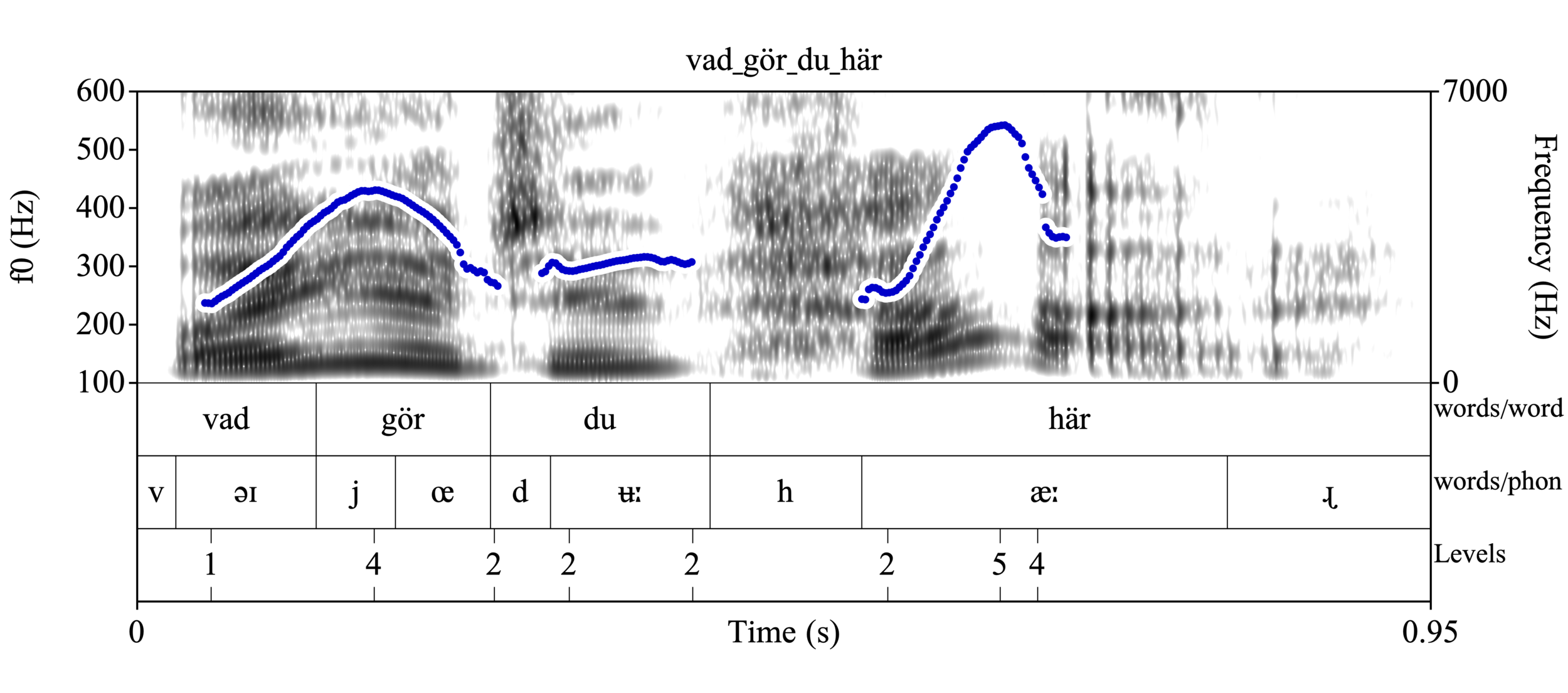 Stig: Vad gör du här?Stella: Hälsar på dig, dumbom!Stig: Hur länge då?Stella: Två veckor.Pitch contour diagrams below each line